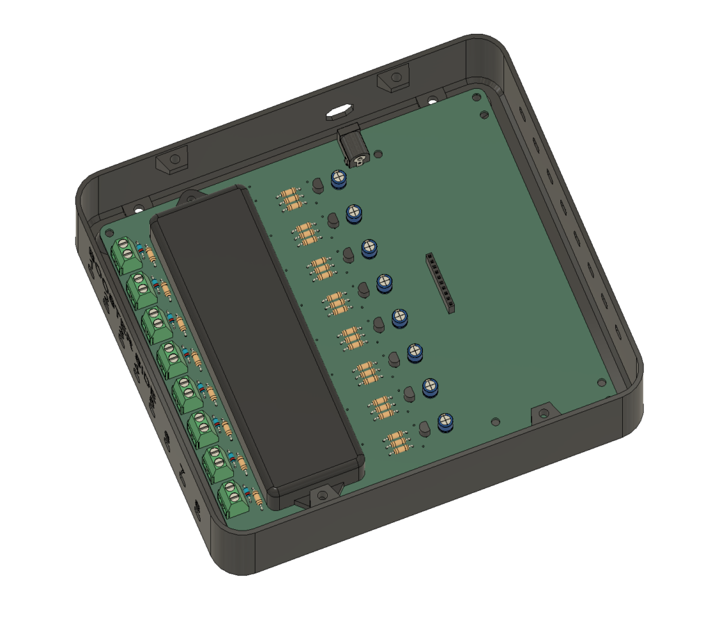 To make everything nice and tidy, I designed a PCB around this setup that adds a few connectors and has mounting holes for a 3D printed isolator for the optocouplers, although my test showed that they already work fine without optically isolating them from each other.