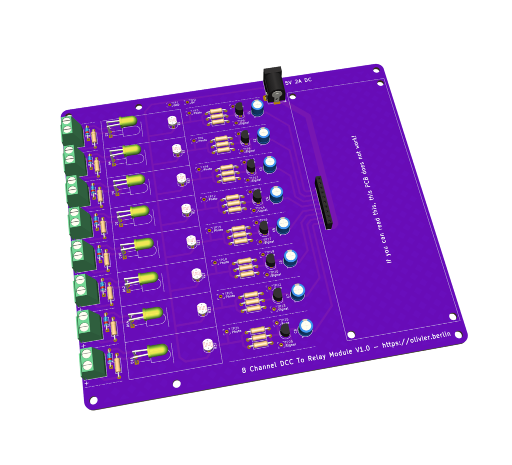 After thinking through many flawed approaches, the solution we finally came up with is quite elegant. To each booster’s output, we connect an LED with a large resistor and a switching diode, to produce a tiny light source. With a photoresistor, we then sense if the LED is on or off, basically constructing our own optocoupler. The resistance of this photoresistor is then used to switch a transistor on or off. The transistor again is used to switch an input of a relay card. The relay card switches one of its relays to toggle the state of an input on a detector. This basically simulates a virtual train appearing on a virtual track segment. This information can be forward along all other train positions to the pc. On the computer, the control software can use these specific input states of the detector to trigger custom actions in return. By setting the boosters via a jumper to not propagate their error on their own, we first prevent all boosters from going offline immediately. In the control software however, after sensing that one of our virtual trains has disappeard (and hence deducing a booster has tripped), we power down all remaining track boosters to prevent any collisions and further chaos, but without powering down the booster for the switches.