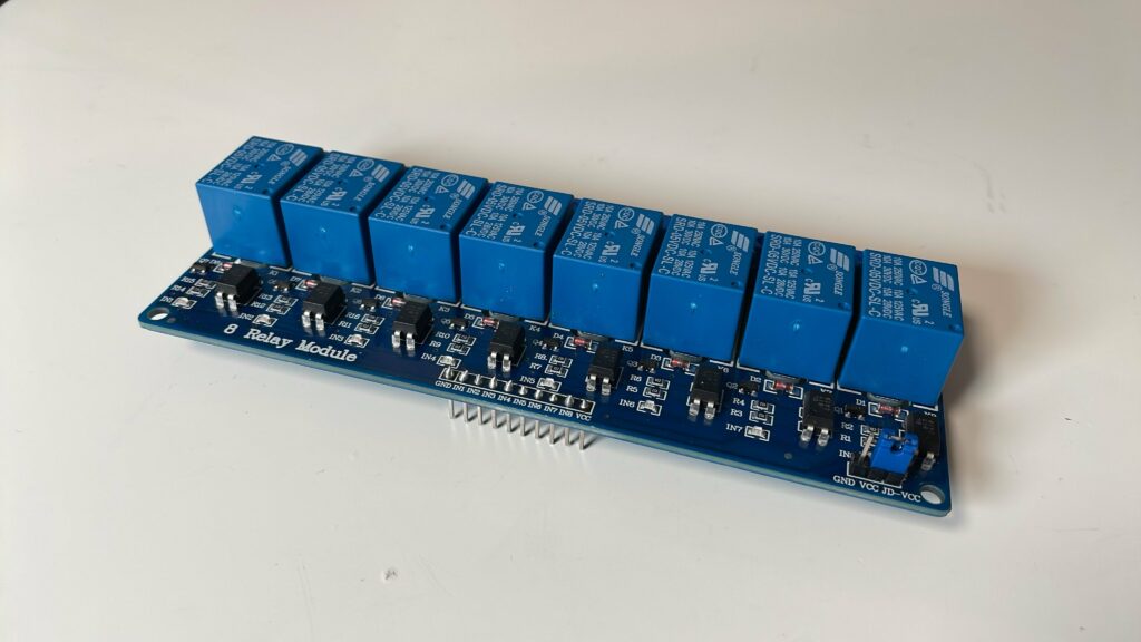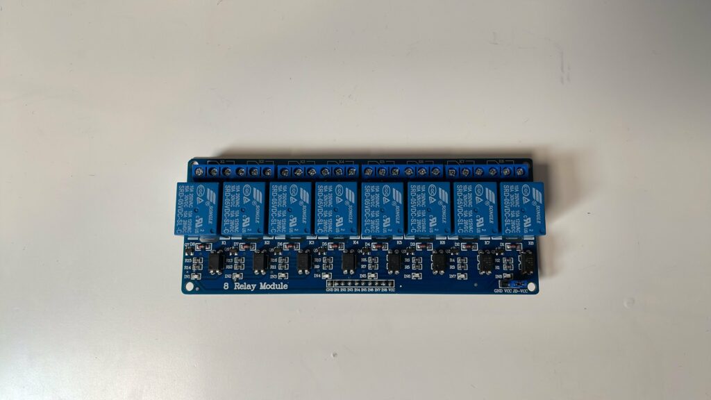 Also, to interface with the detector, we need a standard 8 channel relay card. The only modification to this piece is the pin header. It has to be desoldered, and then resoldered from the back such that the relay card can be used as a plug in component on the PCB.