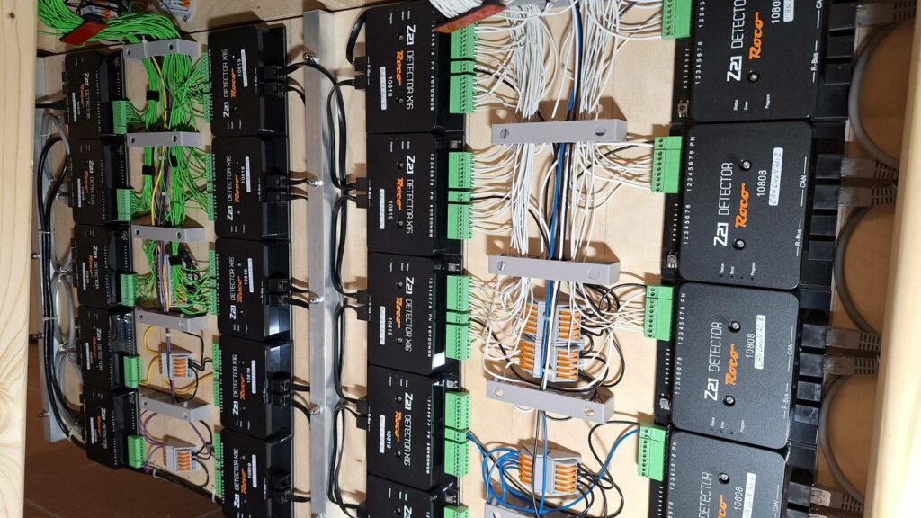 As a bit of context, he is building a sophisticated model railway where everything is controlled by software running on a computer. Trains can be sent autonomously throughout the entire system, where the computer changes rail switches and sets the correct signals for the trains journeys. This produces a stunning simulation of “life” when all of the trains are moving at the same time, in different directions and at different speeds. With the use of so called detectors, the system can also sense in real time where on the system trains are currently at. Several boosters are at work to power different parts of the tracks and one additional booster is used to power all of the motors for the switches.